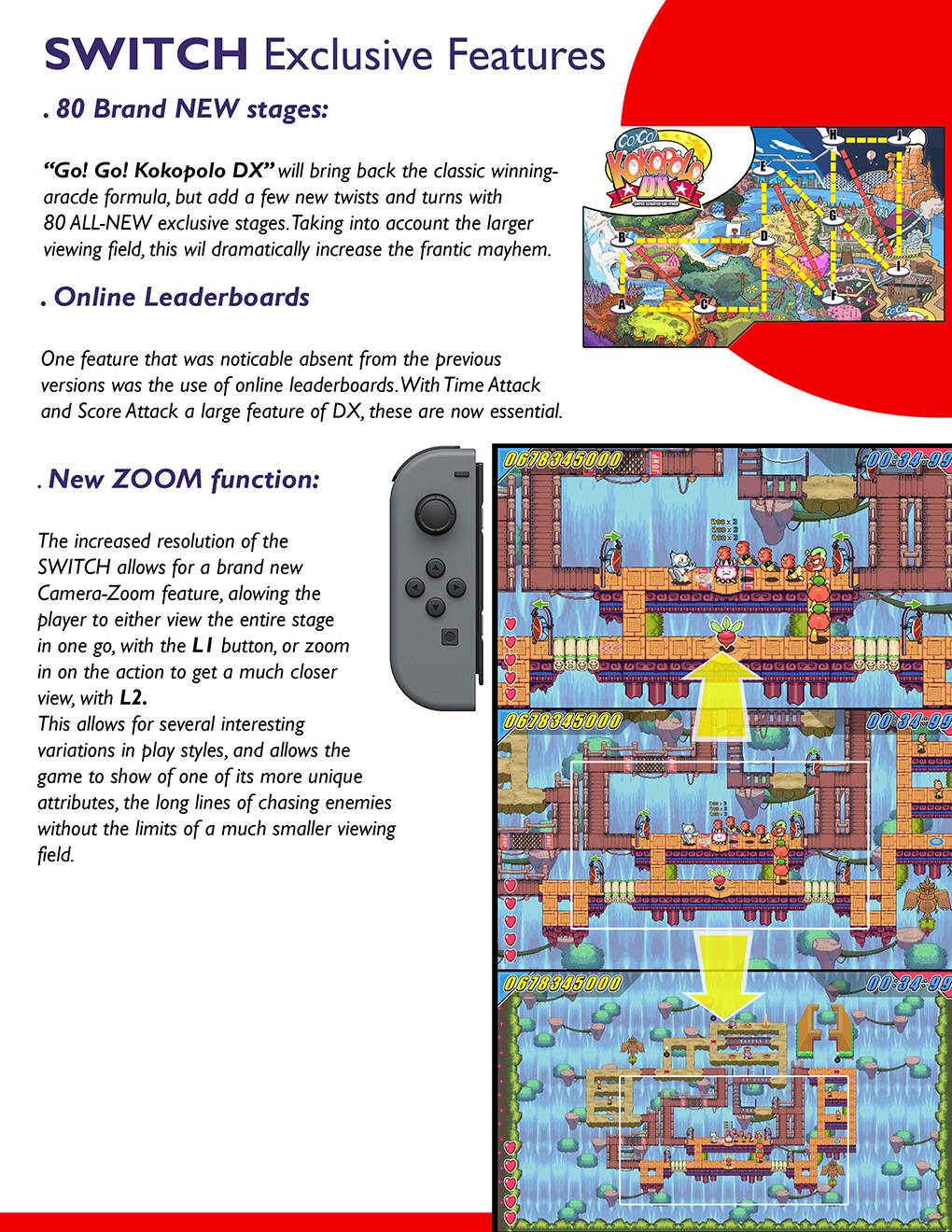 Lately, I read that another new Kokopolo installment, called "Go! Go! Kokopolo DX: Super Scratch Cat Fever" is said to have been worked on for the Switch. The screenshots I've seen did show some promising potential, such as the increased screen size, again, but I've yet to see what's really going on in the game. The one thing I saw was the artwork for the game when it was officially announced, showcasing a new character soaring in the air across the same enemies Kokopolo's faced before, and I'm guessing he's in Kokopolo's next adventure. I can also presume new stages and bosses may be present there, too as well as a brand-new story.