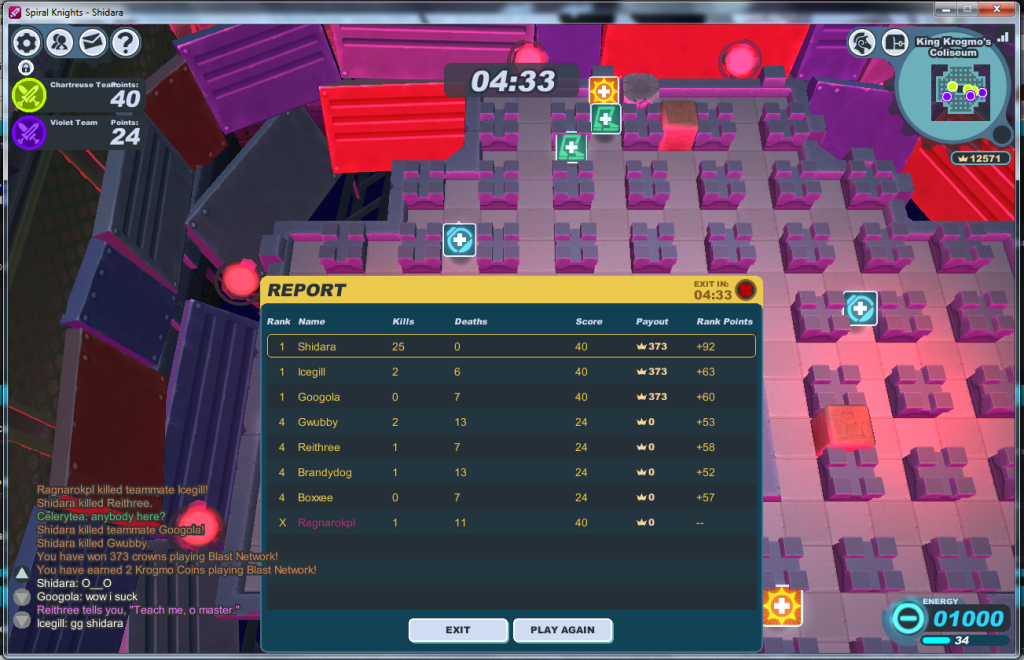 So I just got finished playing a round in the Blast Network and surprisingly went 17-0 for my kill/death ratio. (My highest to date.) I consider this extraordinarily rare for me to get a perfect game with kills over 10, just 3-4 times thus far. For an even bigger surprise, I somehow lost the match. >< Pretty sucky, but I did end up laughing.