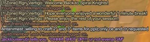 And then... I get many more messages from this guy calling me a 'useless noob', getting his pro cousin "Ehzo" to own me in lockdown, saying many bad things about me (which doesn't make sense), wanting me to quit this game, wanting me to just simply "shut the #)$( up" from just saying "Welcome back to Spiral Knights! Hope you enjoyed your 1 minute break, please enjoy the rest of this session!" almost every time after a server reboot. Wonderful.